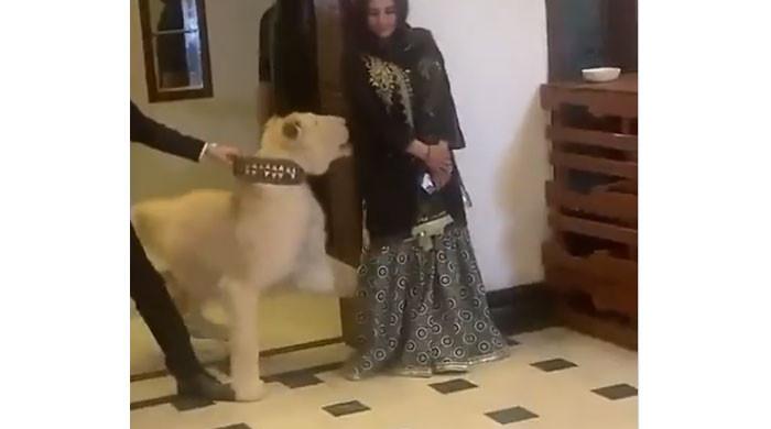 Video shows Hareem Shah trying to take a picture with the big cat but later runs away from it out of fear