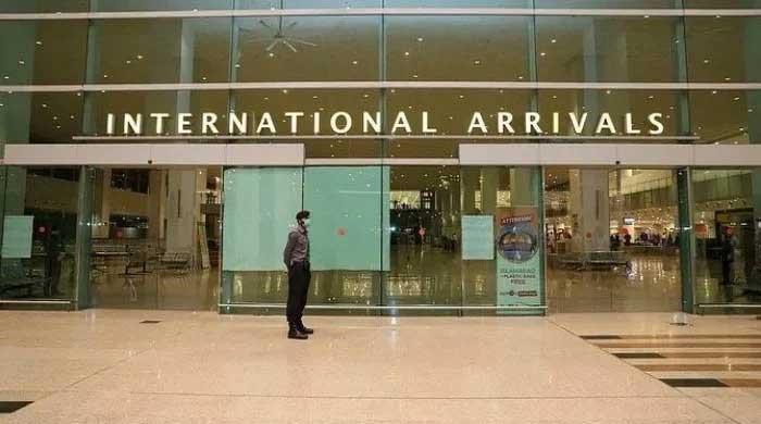 Airport Security Force personnel wearing a mask stand guard at the international arrivals area at Islamabad Airport. — X/@mophrd
